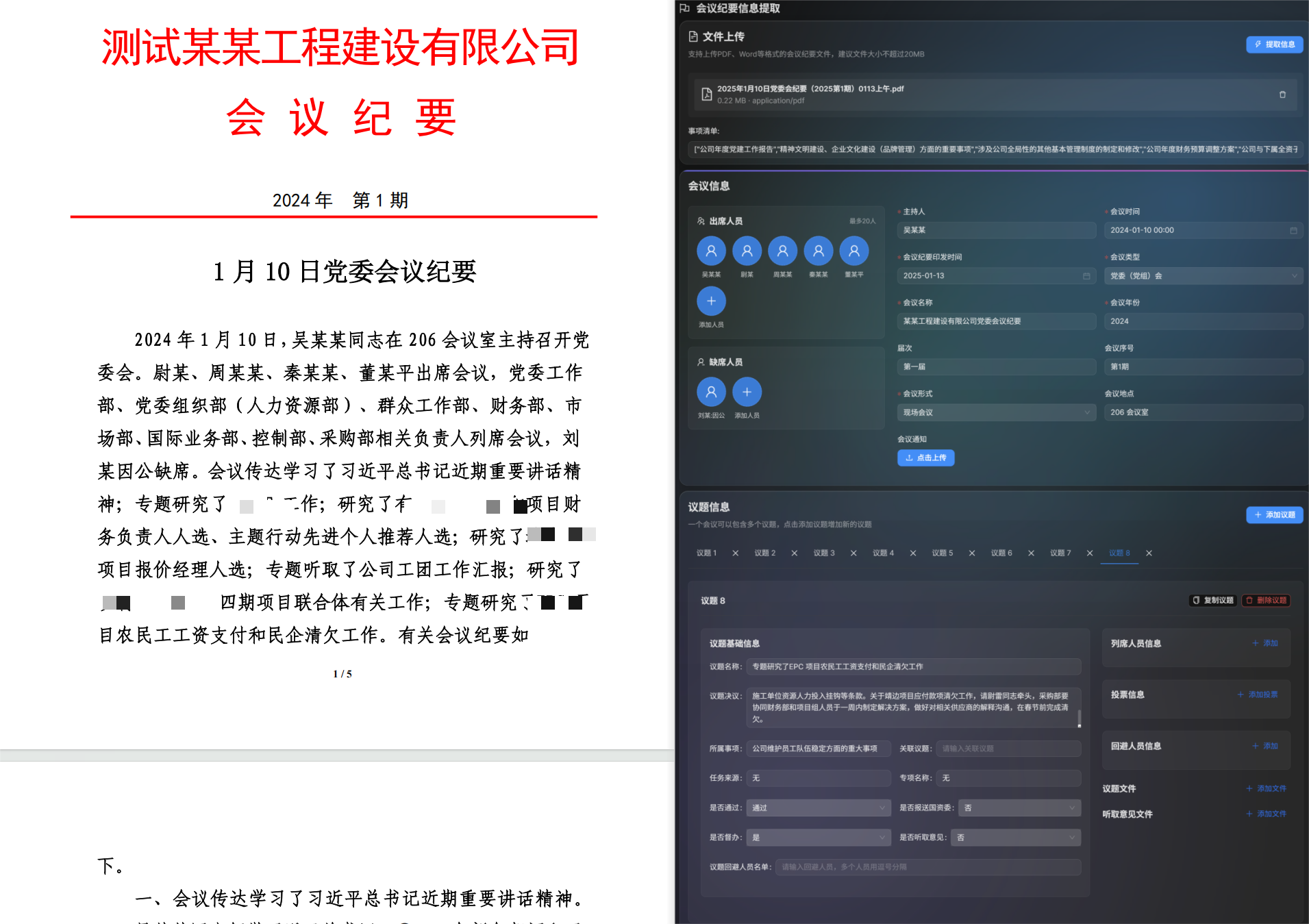 核心痛点:在“三重一大”会议结束后,经办人需从会议纪要中手动摘录、整理多达数十项结构化信息,并再次填报至“三重一大”决策系统中。这项工作不仅重复枯燥、耗时费力,而且极易导致数据错漏。