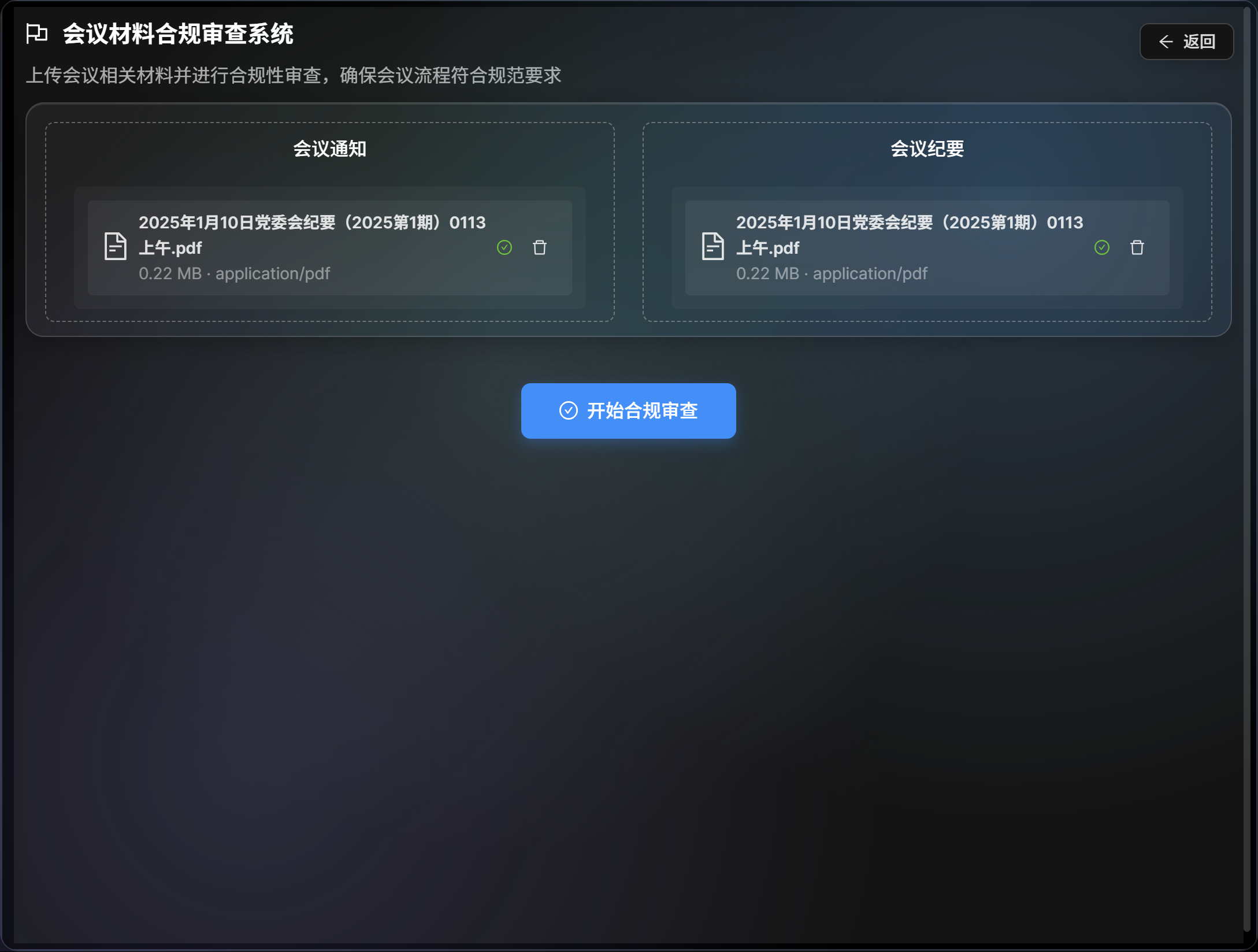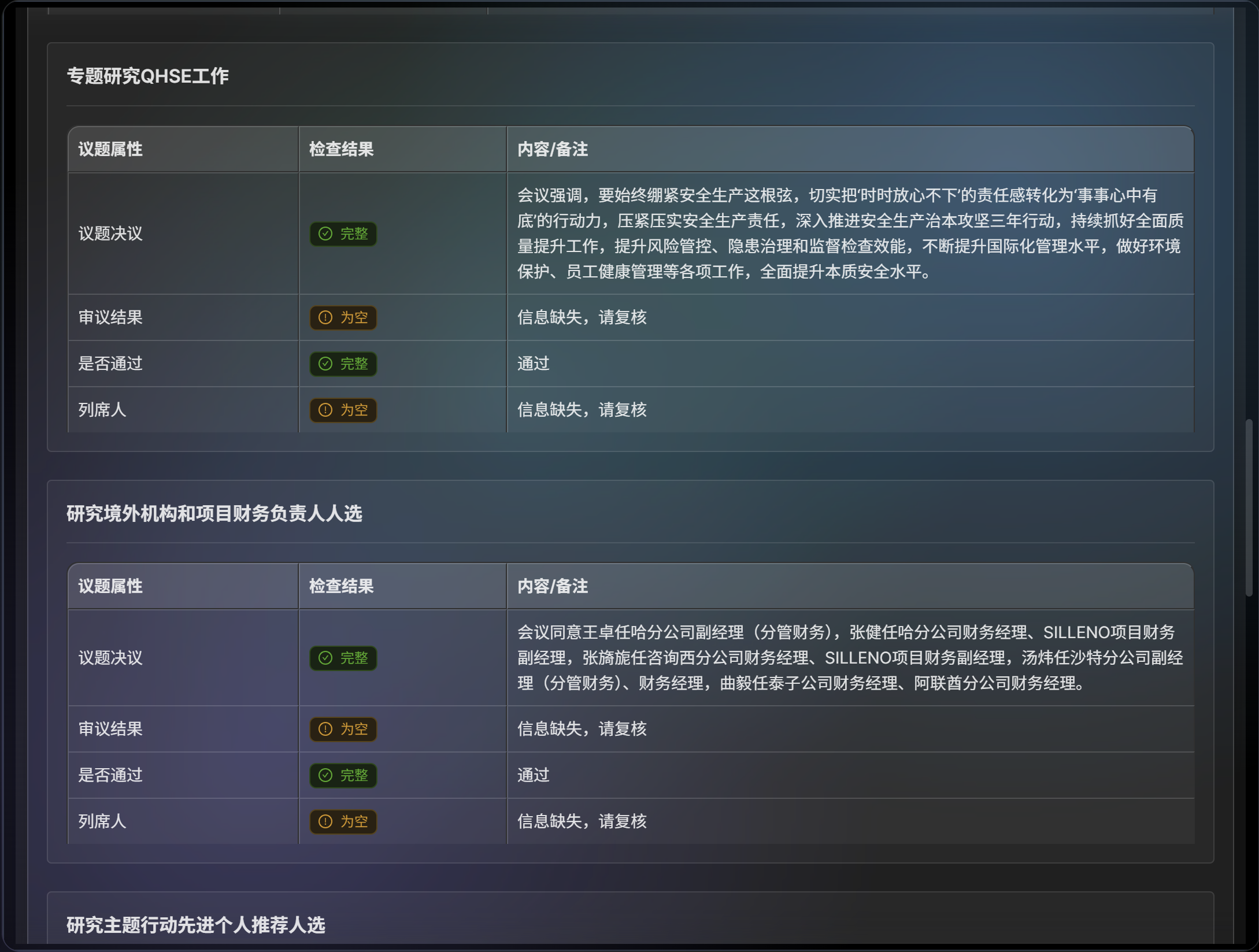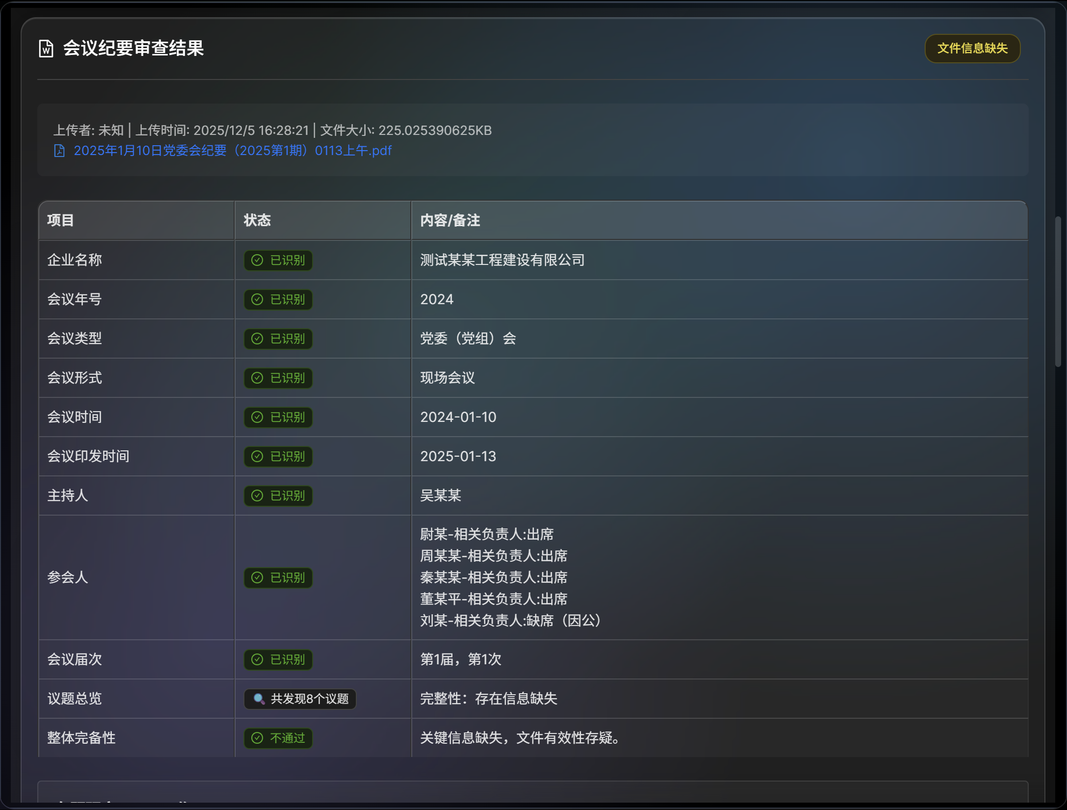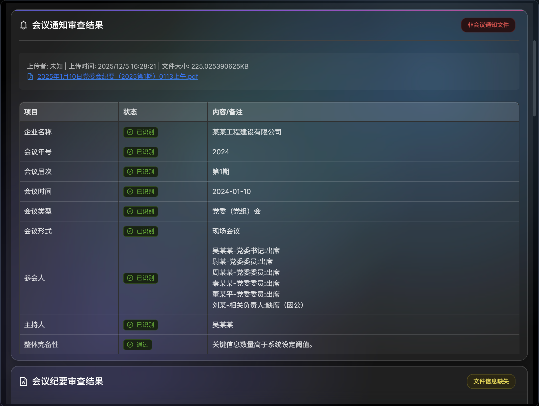 核心痛点:作为集团总部管理人员,各子公司上报的“三重一大”决策文件材料数量庞大,但对文件完整性的基础审核却难以开展。人工核对纪要、议题、通知等文件,不仅耗费大量时间精力,更无法确保100%的检查覆盖率。