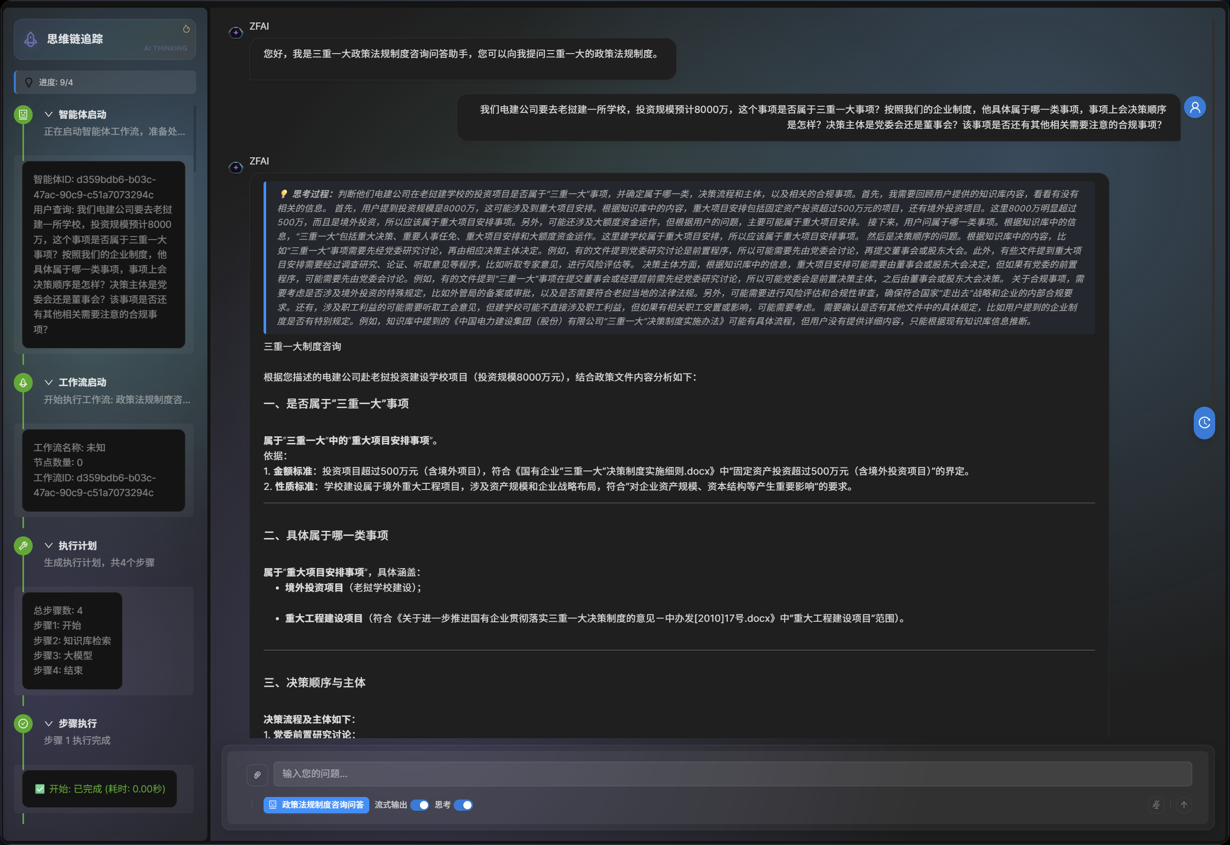 能力介绍:系统采用知识图谱和生成式AI技术,构建了覆盖2000+政策文件的智能智库。不仅能实现秒级政策检索和智能问答,还支持跨文件关联分析和合规风险预警。在央企集团应用后政策咨询量可大幅下降,制度宣贯周期大幅缩短。