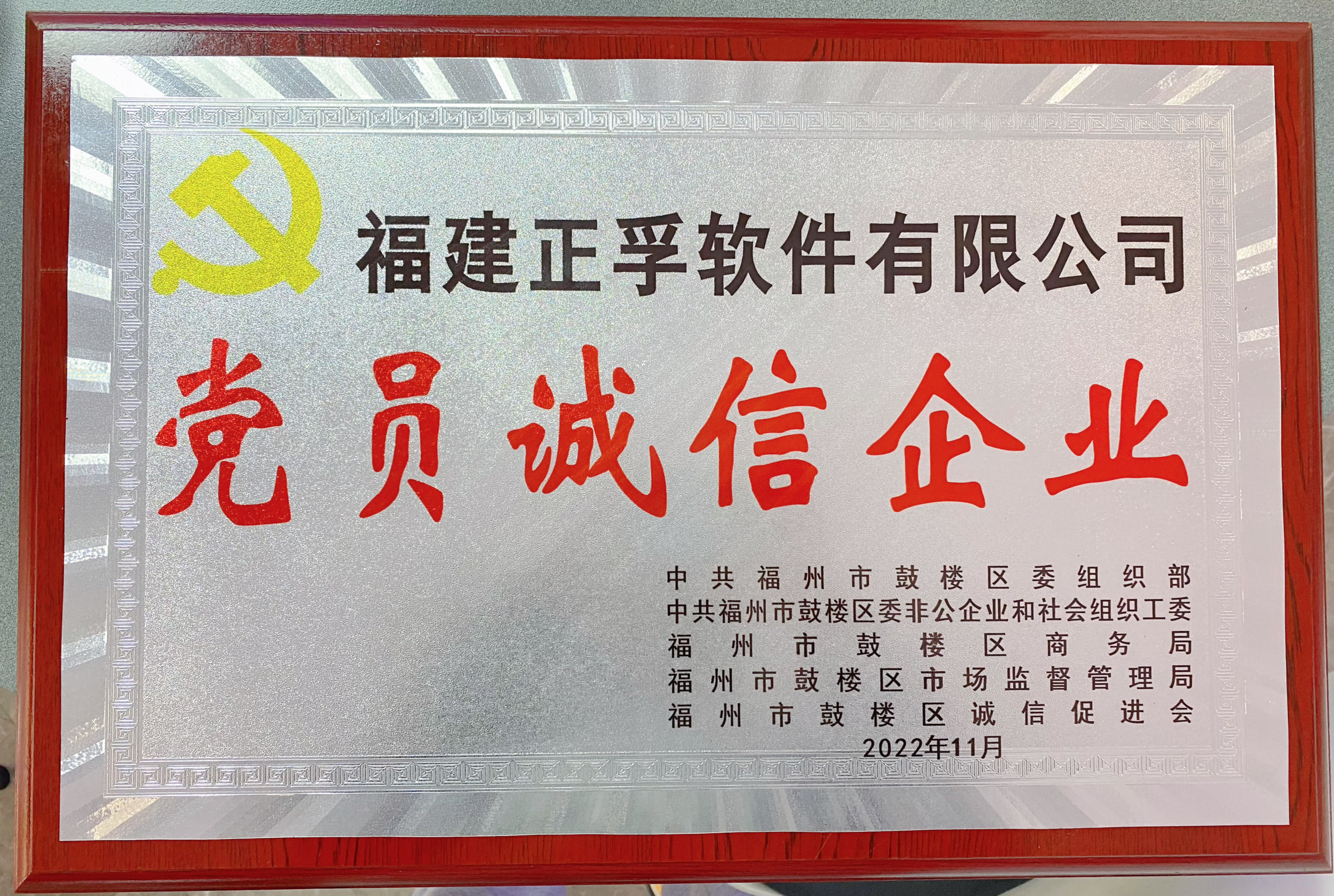 近日,鼓楼区举办第六批“党员诚信示范店”暨第三批“党员诚信企业”授牌仪式在福州软件园党群服务中心召开。福建正孚软件有限公司被中共福州市鼓楼区委组织部、中共福州市鼓楼区委非公有制企业和社会组织工委、福州市鼓楼区商务局、福州市鼓楼区市场监督管理局、福州市鼓楼区诚信促进会联合授予“党员诚信企业”荣誉称号。